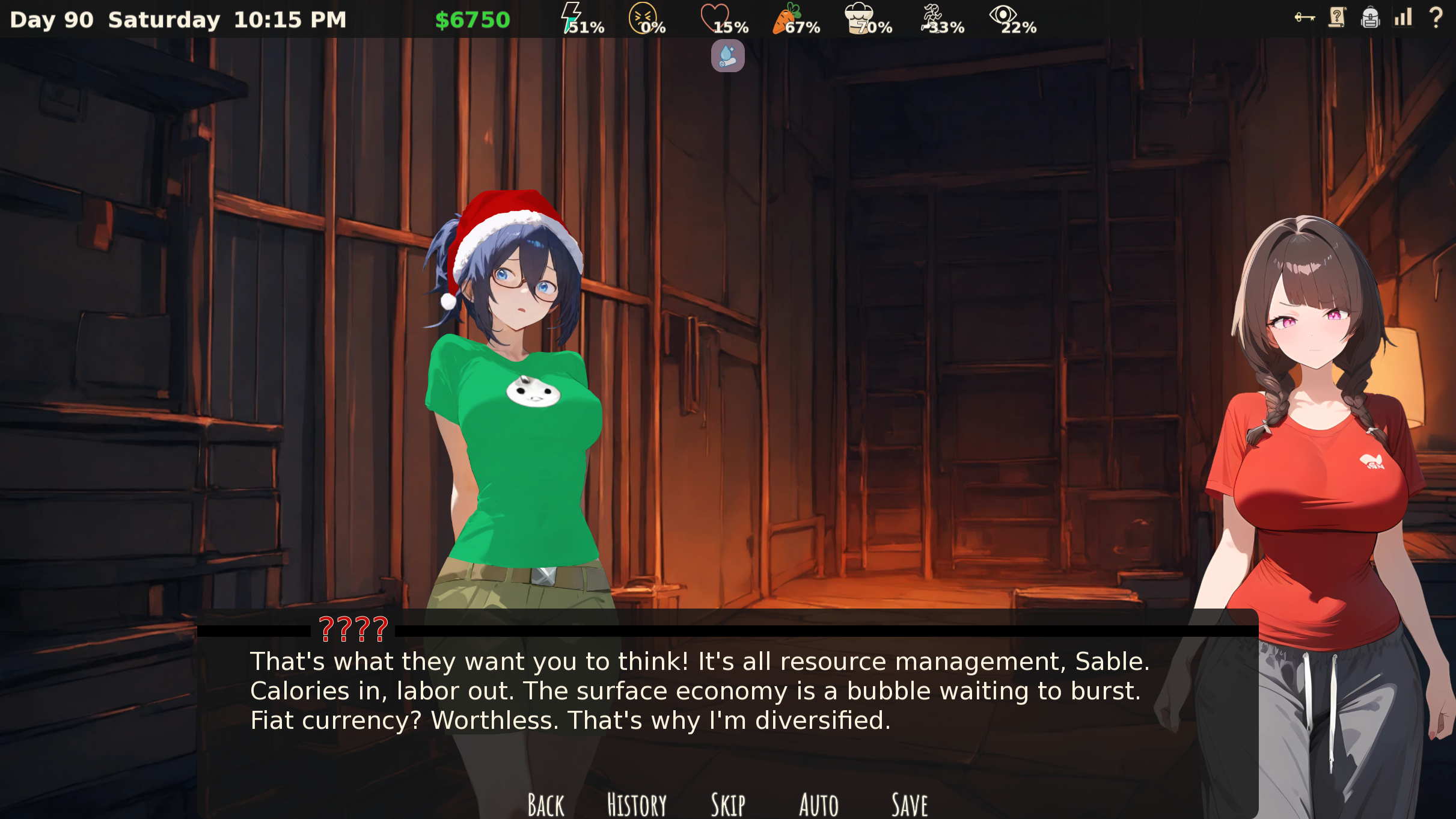 Clothing: Right now, it's pretty simple: each article of clothing has an "appeal" stat (some positive, some negative). Appeal is calculated based on what's showing; for example, wearing an appealing bra and then covering it with a hoodie removes the bra's appeal and applies the hoodie's negative stats. Currently, appeal only governs tip amounts at the Wink, but I'd like to expand that (and I realize now I should probably display the appeal stat in the UI!). I do have plans for exhibitionism content, though there's none currently. Otherwise a few of the current scenes have some minor variation based on outfit, but I'd like to keep that going and add more where I can.